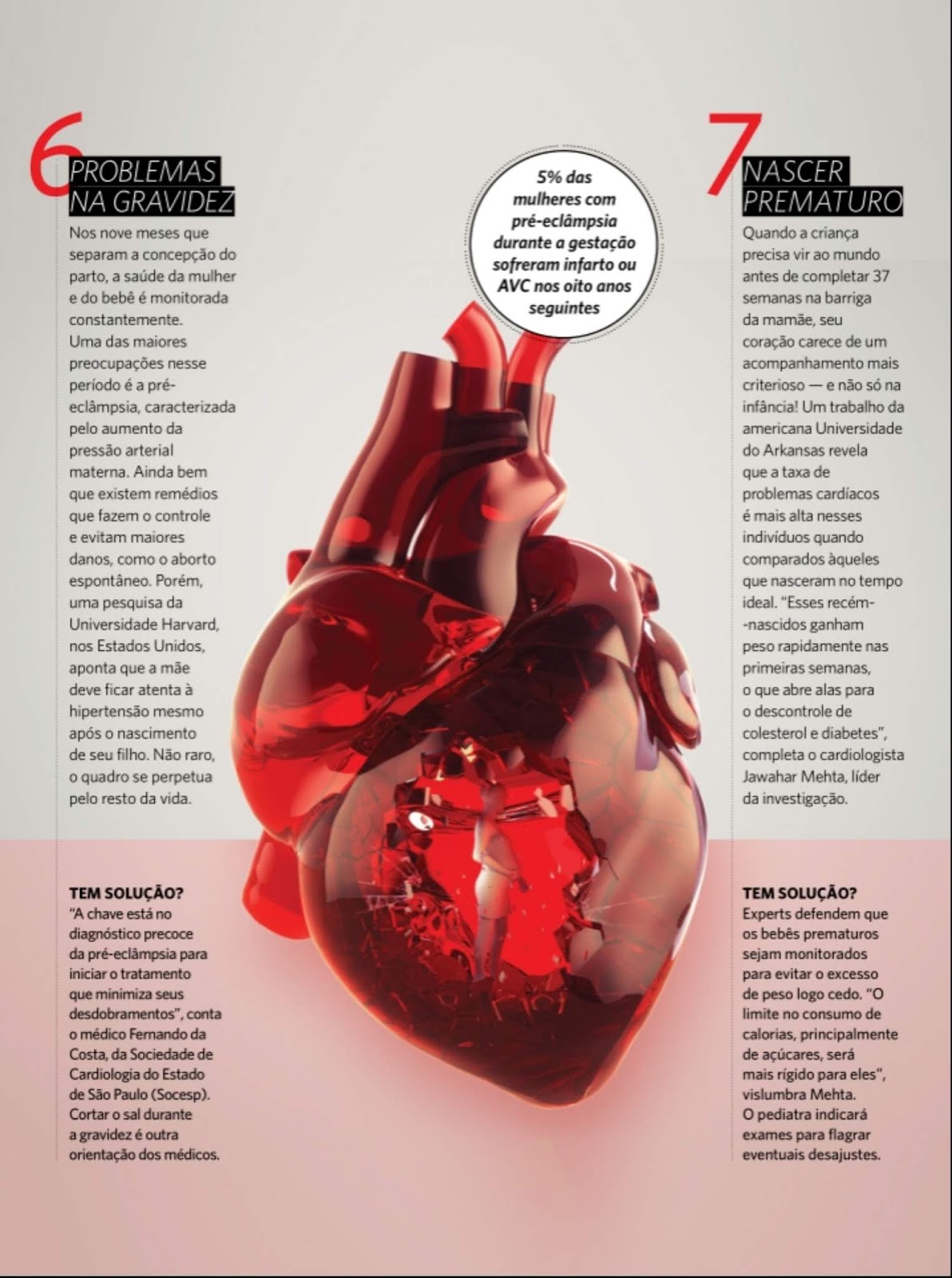 Quando a criança precisa vir ao mundo antes de completar 37 semanas na barriga da mamãe, seu coração carece de um acompanhamento mais criterioso - e não só na infância! Um trabalho da americana Universidade de Arkansas revela que a taxa de problemas cardíacos é mais alta nesses indivíduos quando comparadas àqueles que nasceram no tempo ideal. "Esses recém-nascidos ganham peso rapidamente nas primeiras semanas, o que abre alas para o descontrole de colesterol e diabetes", completa o cardiologista Jawahar Mehta, líder da investigação.